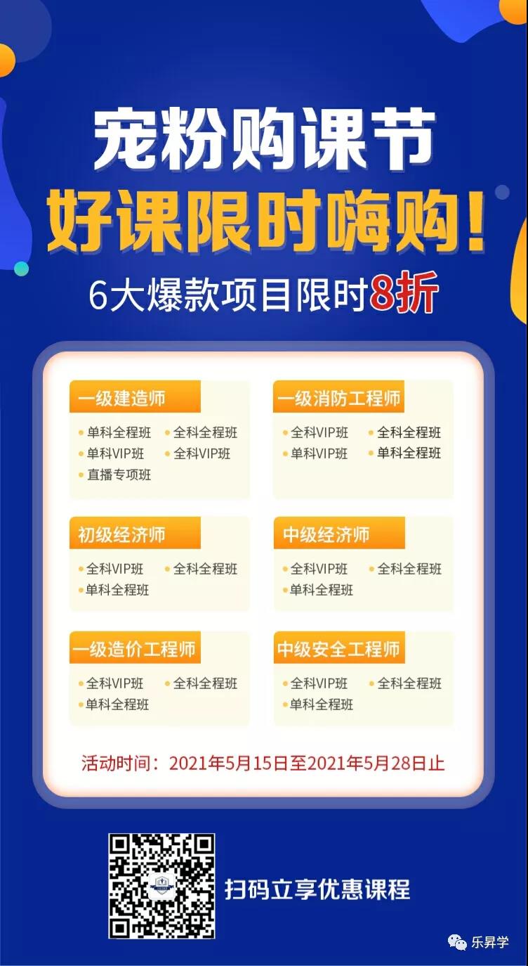 5月15日—5月28日期间机构在“乐昇学教育”平台开通《一级建造师》《初级经济师》《中级经济师》《一级造价工程师》《一级消防工程师》《中级安全工程师》6大项目“单科全程班”“全科全程班““单科VIP班”“全科VIP班”“直播专项班”享8折优惠,宠粉就是任选!